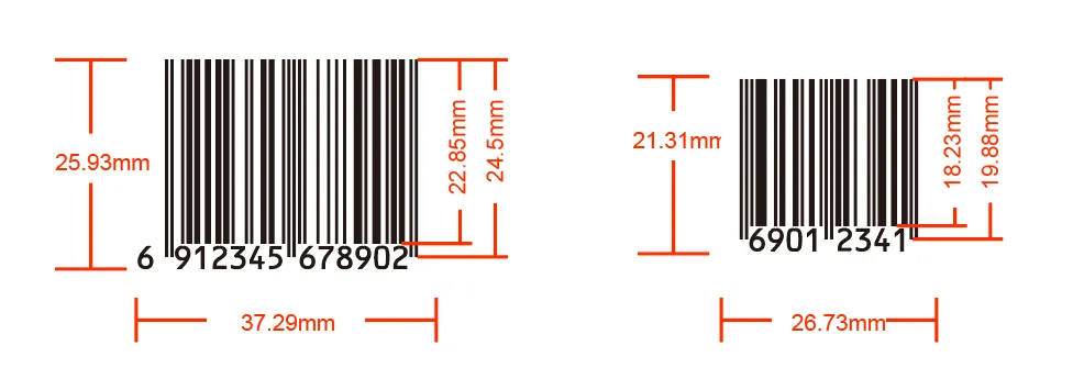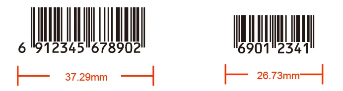 13位(EAN-13)條形碼的基本尺寸37.29x25.93mm,8位(EAN-8)條形碼的基本尺寸為26.73x21.31mm,原則上國(guó)家推薦縮放范圍為基本尺寸的80%~200%。